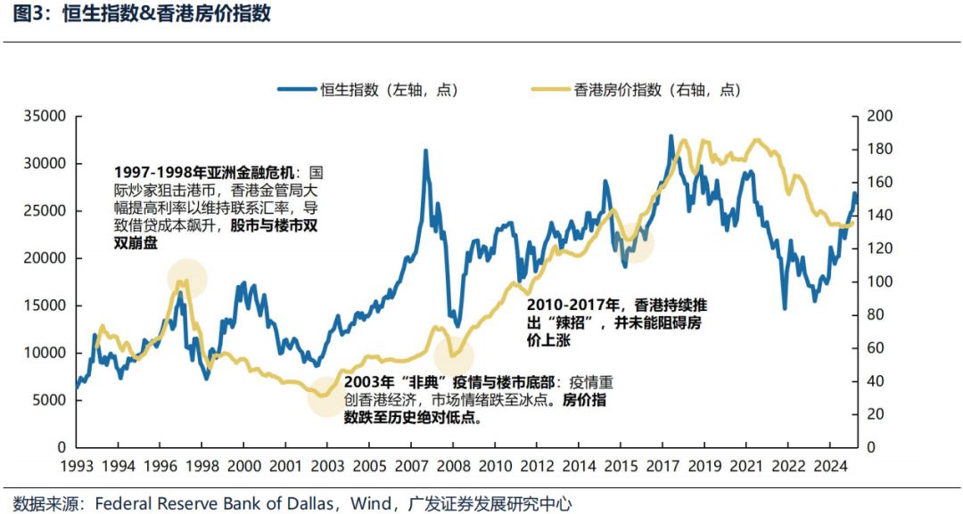 港股流动性更多受全球宏观环境(美联储政策、地缘政治、南向资金)及中国内地经济基本面主导,楼市上涨并非主要影响因素。例如香港楼市在97年亚洲金融危机、03年非典疫情和08年次贷危机遭到重创之后,股市和楼市受共同的基本面与流动性因素驱动,同步企稳回升。当前香港楼市出现回暖,背后实际上是资金环境改善与经济预期转强所驱动,所产生的财富效应与风险偏好回升将进一步提振资本市场情绪,从而形成股楼共振的格局。因此,楼市企稳不仅不会对港股形成资金分流,反而可能通过赚钱效应,推动股楼两类资产进入正向循环。
