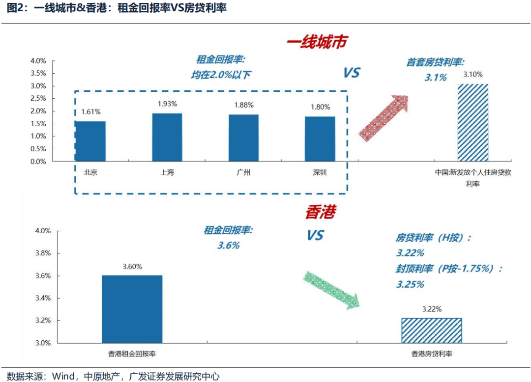 中国内地和香港的“租金回报-资金成本”分化。内地一线城市:租金回报率(低于2%)