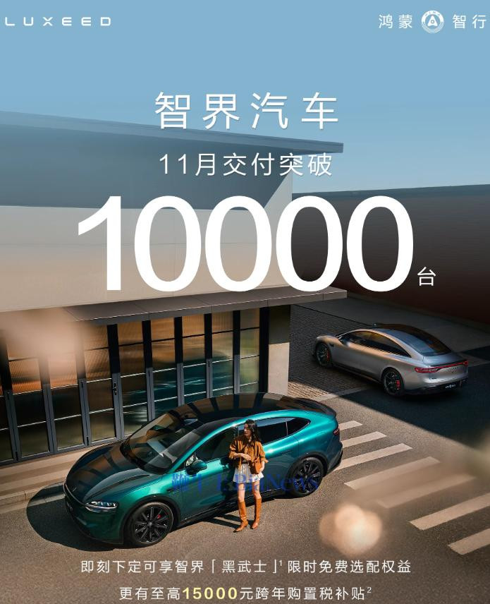 11月28日,智界汽车宣布,11月智界汽车交付突破10000台,连续2个月交付过万,连续3个月大定破万!
