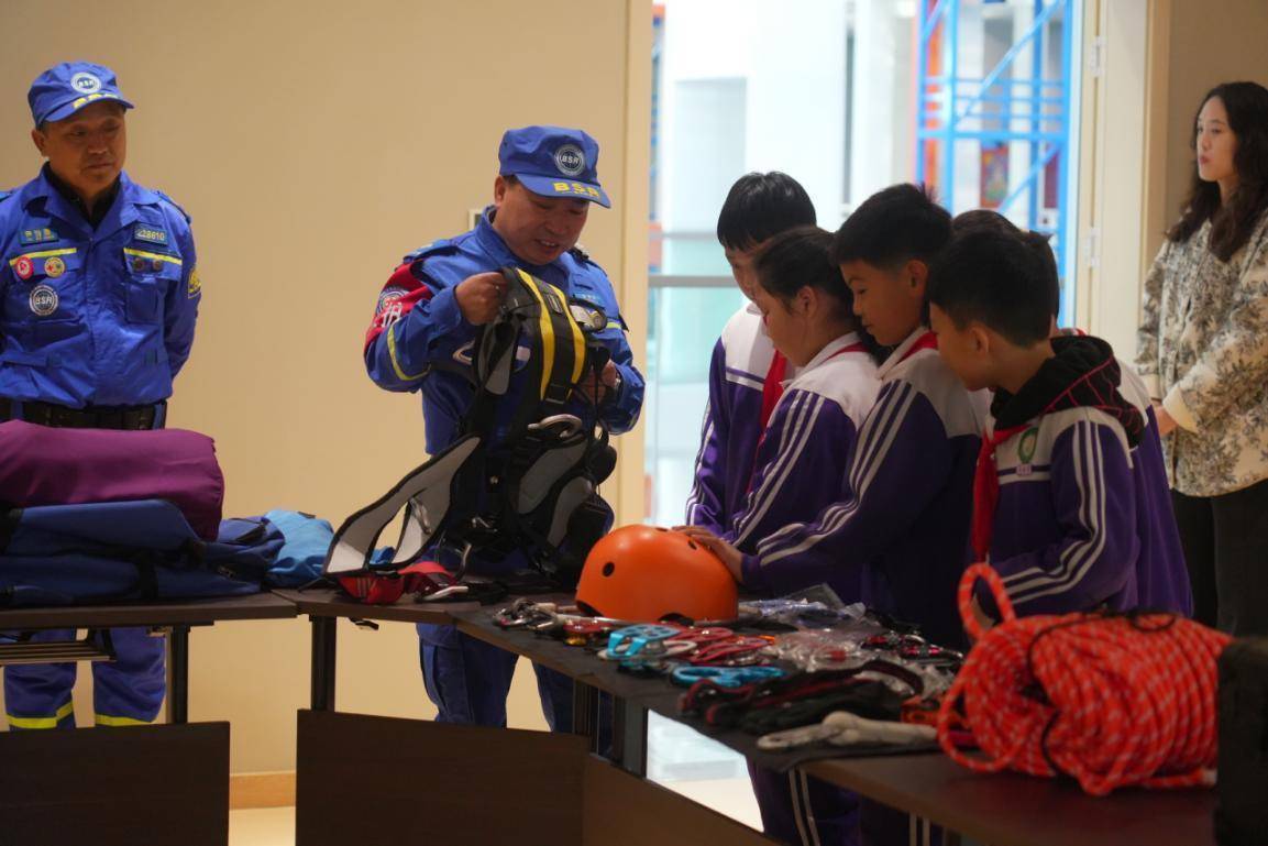 11月5日,在鸡泽县科技馆内,蓝天救援队队员正在向学生们介绍救援设备。王佳琪摄